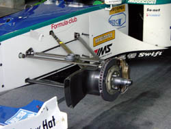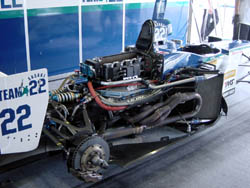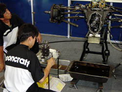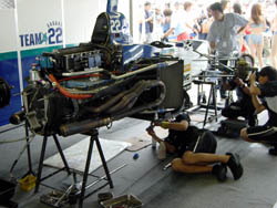 | リアサスはトランスミッションに付いてます。 いまどきのフォーミュラカーですから、 エンジンブロックと変速機のケースがくっついていて、 車体構造の一部になってます。 決勝前にギアもばらされていきました。 | |