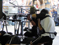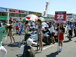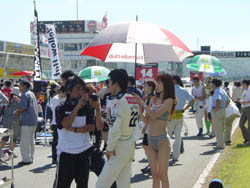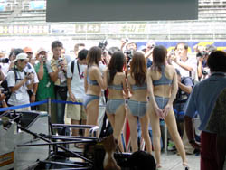 | 整備をしている間に、レースクイーンたちの サービスタイム。 後ろからなのでケツとかまぢまぢ見てますと、 基本的に「鍛え上げられた」身体ではないから、 ケツは下がり気味かなー。 やっぱり、女性が男性に対して期待するのと同じで、 「垂れたケツ」「小さいケツ」よりは、「引き締まったケツ」 の方が一般的に価値が高いのかと思います。 | |