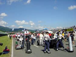 | ピットウォークも終わり、コースインして 決勝の始まりです。 エアのボンベを持ってきて、エンジンは冷やし、 タイヤは暖めるという努力。 まだまだメカの人がたくさんいて人だかりですね。 | |