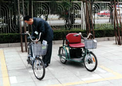 自動車の方は登録するのに免許証を見せて署名もしなければ ならないので並んでも乗るのは大変ですが、自転車の方は 気楽にチケットをもらって乗っていました。 面白いのは、右側の3輪車。 いわゆるおばちゃん御用達のワゴンタイプの自転車ですが、 ペダルもなく完全に電力駆動のみ。 電池はお尻の下で、フロントにモーターが付いているFF方式。 |