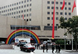 北京というのは、非常に乾燥していて、しかも埃っぽい。 都市部のモータリゼーションは進んでいて、赤いシャレードの タクシーがたくさん走り回っている。 触媒なんてもんは付いてないから、大気汚染のレベルは深刻だ。 着いたらさすがにルシオールは埃だらけで、展示用の2号車を 「ベガワックス強化タイプ(花王)」で磨く。 |