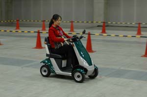| 展示会場の端は、室内の試乗コースです。 試乗チケットは売り切れていたようなんで、 眺めるだけにしました。 はじめは、このセニアカーだけでしたし。 | |