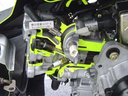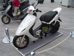 | EC-02もいいが、 心惹かれるのはホンダのDio Z4 (カットモデル)。 なんと50ccなのにインジェクション。自動車技術か何かの学会誌に、 微少流量なインジェクションがいかに大変かというのが 熱く語られていたのを読んで、感激した。 確かに、50ccに吹く燃料なんて鼻くそ並み。 | |