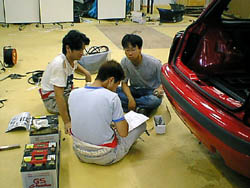 | 今年は多摩美大との共同研究を行っているので、多摩美大の 学生さんたちの訪問をうける。 共同研究は、新しい自動車のコンセプトを作ろうという目標ですが、 まぁ、とりあえず今まで作ってきたコンバート車に試乗していただきましょう ということで、試乗会。 | |