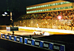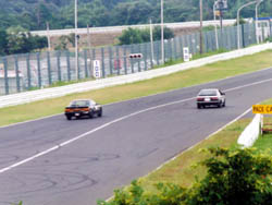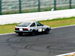 ほかのクルマは帰ってきたのに、「とうふ号」だけ帰ってこない。 最後に帰ってきたブラッシュボーイズの藤沢さんに「86知りませんか?」と聞いたら、 「イィー物見せてもらったよ」との答え。 ピットレーンの入り口で見事に刺さってるよ、とのお話。 |