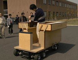| 遠隔操縦は車両に取り付けられたカメラを見ながら運転しますが、 一つのカメラで車両感覚もつかみにくいこともあり、電波が悪く なると画像が乱れたりするので、見える範囲だったら直に目で 見ながら操縦してもいいのです。操縦は、ゲーム用のパッド。 | |