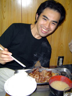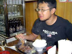 まぁ、しかし市場市場初体験ということで、あまり無理せず普通盛りご飯です。 でー、ご飯が揃ったところ。橋本君の頼んだすきやき定食はうまそうですねー。 |