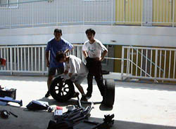 なぜかというと、完成した後で試乗しまくってしまい、 輸送する前に充電する暇がなくそのままつくばから鈴鹿へ 持ってきてしまったため、電気があまり残ってなかったのです。 |