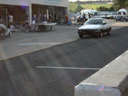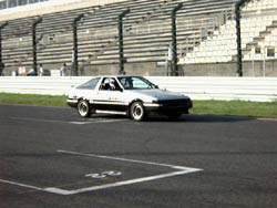 ストレートを疾走するEV86。 東コースを5周したフリー走行の結果は、3周めにベストラップ。 ストックでは5位の1'27.111でした。 というのも、ほとんど全力で走れなかったのです。 |