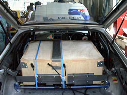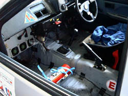 朝九時から、順番に出張車検。 FIAのおっちゃんが来て、「このバッテリーケースは車体に固定されて いないからだめだよ」「ヨーロッパじゃ人死んでるよ」と脅されましたが、 それでも車検は通過。 青のPPバンドが、か弱い命綱です。 |