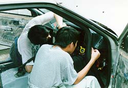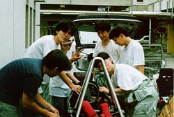 カウル磨き部隊。 このfjのカウルは、かなり痛んでいました。 欠ていたり、割れている部分もありましたし、割れたあとの 補修がいい加減で段差になっていましたから、 磨いてパテで補修をして面をだします。 |