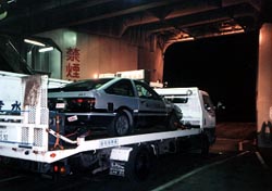 フェリーに載せられたEV86&積載車キャンター 夜中の2時発の便で、香川県は高松へ向けて出港です。 EV86には「藤沢とうふ店」のステッカーが貼られているので、東名高速を走っている 他の車(特に20代の若い人たち)やフェリーの受付の兄ちゃんなどに 人気でした。 |