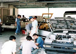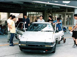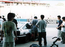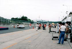 今年から練習走行と予選がくっついて10分づつという 日程が組まれています。 でも、練習走行を走ってしまうと電池がなくなってしまうので、 電池交換システムを持っている東京R&DのZERO-1やFE95以外 のクルマは全く練習走行に出れません。 練習走行と予選をいっぺんにというのは無理なんです。 |
