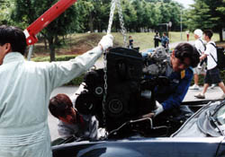 安物エンジンクレーンで、エンジン降ろし中。 なにせ、手順の悪いものですから錆付いたネジを 舐め、エキマニを外すのに一苦労。 エンジン下でマフラーをグラインダーで切り落として 外すはめになりました。 |