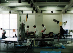 宿は、習志野校舎の近くにある実籾校舎の「談話室」 ここが合宿中の家です。 みんな寝袋持参で、洗濯もこのとおり。 |