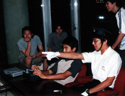 夜のレクリエーションにはプレイステーション。 本物の駅員はちゃんとコスプレで、「電車でGo!」 |