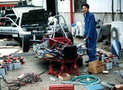 担当のイノっち(通称) 昨年の鈴鹿からバッテリーステーの強度不足は再三指摘されてきた ので、今年はその対策が98eの大きなテーマ。 |