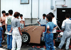 98eのもう一つのテーマ、「カウリング」をつくる オープンクラスといっても、裸で走らせるわけにはいかないので、 皮を被せないといけません。 ある学生の実家が「段ボール」会社ということもあって、 98eのカウルは段ボール製に決定。 恐らく、世界初?? |