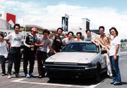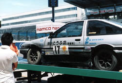 グリッドで記念撮影 最高出力がわずか40kWとパワーは圧倒的に他の直流モーター車に 負けますが、誘導モーターと86のボデーのバランスの良さでは、 いいところ行っていると当人たちの自慢です。 しかし、わずか5周10kmという鈴鹿のレースでは、 どれだけパワーが出せるかが勝負になるので、「勝ちに行く」 ことはどだい無理な話ですから、今回は3度目の正直、「完走するぞ」 が目標です。 |