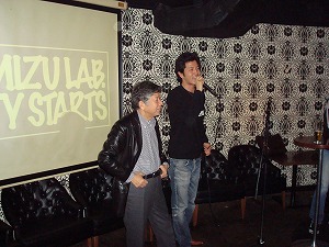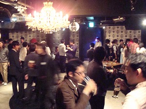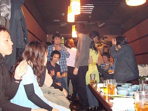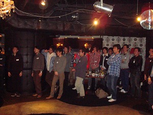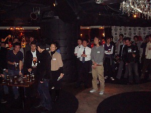 二次会は渋谷開催だったが、人数が多くて、最初は部屋の1/3が立ち飲みのまま。 古い顔の者たち(ジジィたち)だけは、奥に陣取って座る。 |