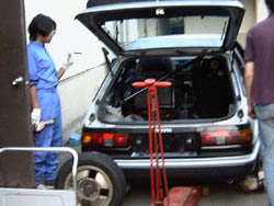ここまで来たところで馬(リジッドラック)にかけます。 研究所のでかいジャッキでリアのホーシングごと上げるのですが、 もともと車高が落ちているので、まずはジャッキをかけるために ジャッキであげなければいけません。 |