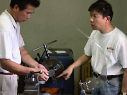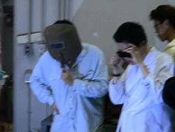この日は、機械加工を体験するということで、まず溶接から やっていきます。 目をやられないように面や擦りガラスを通して見ますが、 それでも溶接されている中心は強い光です。 鉄が溶けているので、すごいエネルギーですから、 長袖でないと強い紫外線で日焼けします。 |