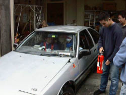 0-400m加速試験。 運転者と、測定要員の二人が乗り込み、フル加速の試験です。 車重が重要ですから、運転者と測定要員の二人の体重もパラメータに入って きます。 |