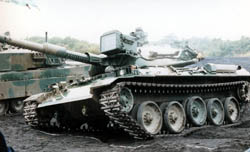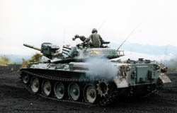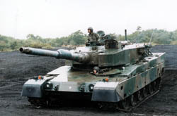 74 type tank. "Nana_Yon Shiki" Tanks have hydraulic suspension system. 90 tank can change only pitching direction, 74 can also change rolling direction in this picture. 90 tank need not to rolling when fire because FCS(Fire Control System) made progress between 74 and 90. Round turret is beautiful. I can understand that the round design can make the armor stronger than square one, because stress on the materials will not concentrate easily. 74 tank has 105mm gun without autoreload. So reload work must made by man power. |