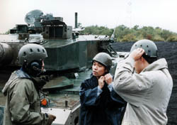 Riding carefully The height is not short, because the standard height of this 90 tank is 2.3m. It cannot be tall seen from a distance, length beging enough big. The main gun,120mm tank gun, is produced under license of Germany. It needs 120mm big to shoot fin stabilized shells. It isn't rifleing gun used to be. After lunch we were taught about the tank's guns and shells, for example APFSDS, HEAT ,and etc. |