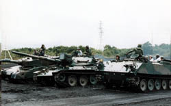 Start to drive. From left, 90 tank, 74 tank, and 73 type APC(Armored Personnel Carrior) called battlefield taxi. 73 APC is light weight, I don't know 13 tons is light or not, because it is made of alminium materials. It can float on the water with special kit. But now alminium armor is not popular because the charactor of alminium to burn under high temperature. |