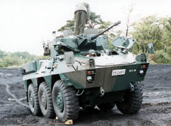 6 wheeled 87 RCV (Reconnaissance Combat Vehicle) Wheeled vehicle can run faster than other combat vehicle with track (caterpiller). Run flat tire is equiped with this RCV, that is not like Michelin PAX that has small rubber band in the tire but the tire's sidewall is very thick not to break even if the bullet would hit the tire. Isuzu's truck is a basecar and was made all 6 wheel drive and front 4 wheel steer. In the picture rear 4 wheel drive and front 4 wheel steer,it is too complex. |