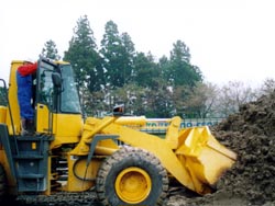 昔のアメ車のようにAピラーがなくて キャビンの視界は良好。 ホイールローダーは、バケットを地面と水平にしてから 山に突っ込み、突っ込んで止まったところで、前進しながら バケットをすくい上げていくとちょうどうまく土が乗っかる。 土をすくうという作業は、やはり楽しい。 でも、油圧シャベルの次ぐらいかな。 |