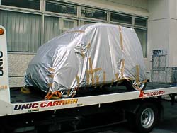 ボディーカバーがかかって何か分からないが、とにかく小さい車。