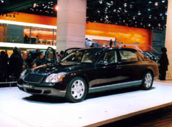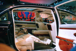 「デカイ」といえば、やはりマイバッハ62だろう。 日本では4500万円ぐらいだそうだが、Sクラスの5.5リッターツインターボで550馬力。 全長が6.2m、全幅2m、重量約3トンとくりゃ、KAZ並に乗用車としては巨大なクルマだ。 しかしKAZに見慣れているせいか、ホイールベースが長い割に背が低く、 275/50R19というタイヤが付いているだけでは貧弱な感じがする。 この点では後に出てくるロールスの方がイイ感じ。 |