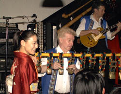 | スイスらしい民族音楽が演奏されていて、 もちろん「ヨロロエヒィー」なんてのも聞ける。 これは、ノコギリの楽器ですね。 後ろに見える階段に立てかけてあるホルンは、階段の上から吹くながーい ラッパですが、これに挑戦のコーナーでは「若き血」も出て 大盛り上がり。 | |