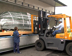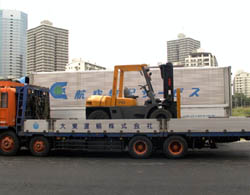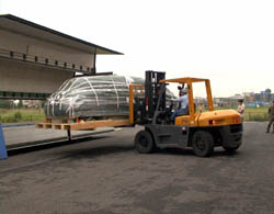 | MULEの姿で出て行ったKAZが飛行機に乗って戻ってくる。 KAZを載せたトラックと一緒に大型のフォークを載せた 平トラックがやってきた。 | |