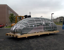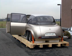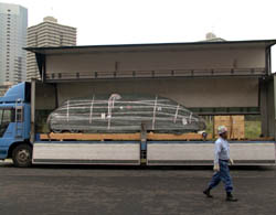 | というのも、ウィングボデーを広げると、 トラックの中のKAZはこんな状態。 パレットに載せられ、サスペンションのエアは抜かれて お腹が着地した状態で固定されている。 | |
