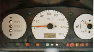 メーターは一般的なものですが、EVならではの警告灯がついています。 鉛電池を使用していますので、電池の残量は消費電力を積算して求められます。 |