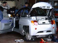トランクルームが見えますが、この車ではインバータなどでいっぱい になってしまってますね。 次の車ではコントローラ関係もBBF内に収めてしまいたいと清水さんは申して おりました。 |
