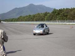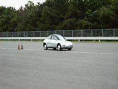 パイロンを立てて、スラローム走行をしています。 ロール量はやはり大きめですが、それよりもロールを始めるタイミングの方が ドライバーにとって大切です。 |