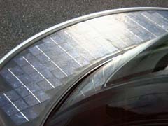 ルシオールのスポイラーに張り付けられた太陽電池です。 ルシオールには、屋根とスポイラーに80Wの多結晶型シリコン太陽電池 がついていて、補助的にバッテリーへ充電を行なっています。 80Wの太陽電池ではたかがしれていると思いますが、計算すると年間1000km 走行分のエネルギーをまかなうことができます。 ただし、太陽が当たらないと発電しませんから、屋根つきの車庫に入れては いけませんよ。 |