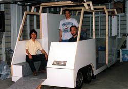 仮組みを終えたところで記念撮影。 5/20から始めて、実質製作日数2週間。 1/1で、フルフラットと低床化でスペースユーティリティーが高く、 8輪で乗り心地の向上をアピールするモデルです。 また、前後両方からストレッチャー(担架)を出し入れできるのも 特徴です。そのために左ハンドルになっています。 |