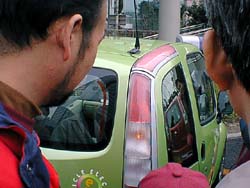 利用者はキーレスエントリーの鍵を持っていて、 クルマのところでボタンを押すと、センターで配車された 車輌がハザードを出して答え、乗れるようになります。 |