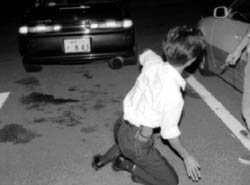 車にひかれそうになる人もおります。 |