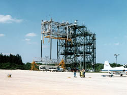 写真は、クルーを待つハンガーにある、シャトルオービターを ジャンボの背中から降ろす治具...というか、クレーンですな。 今回のアトランティス(OV-104)も、前回の飛行のあとコックピット周りの 改修を受けたので、ジャンボの背中に載せられてここへやってきたはず。 |