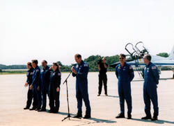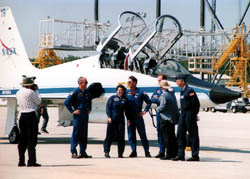 2人は先へ来ていたらしく、5機の戦闘機がブルーインパルス並みの フォーメーションでKSCの空を舞った後、並んでハンガーに入ってきた。 「そんな必要あるのか」って?いやぁ、そりゃ格好いいからでしょう、やっぱり。 宇宙飛行士というのは、精神的、肉体的、心理的など含め様々な面で優秀な エリート集団であると同時に、格好良くないといかんのじゃ。 そんな演出が手伝っていても、やはり彼らは格好良い。 |