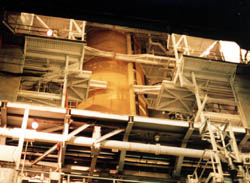4つあるうちのひとつのベイには、外部燃料タンクがセットされていました。 隣のベイには、オービターもセットされているということでしたが、 内側からでは、どこにあるのか全然見えませんでした。 |