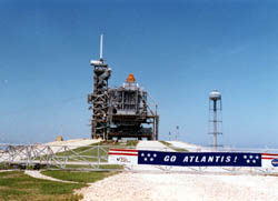 発射台39Aに据え付けられたアトランティス。 この時もまだRSSに囲まれていて全体は見えません。 この発射台もアポロ計画のために設計され、 ここは実際に月へ行ったアポロ11号から17号の全ての サターンV打ち上げに使われたまさにその場所です。 もちろん、シャトル打ち上げ用の大改造を受けてはいますが、 これもアポロ計画の遺産には違いありません。 |