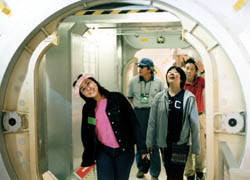 ちょうどイースター休暇でアメリカのゴールデンウィーク だったので、KSCも観光地なので一般ビジターツアーに 含まれている国際宇宙ステーションセンターは観光客でいっぱい。 ここでは本物の宇宙ステーションモジュールが組み立てられていますが、 まずはお決まりの簡単な模型。 |